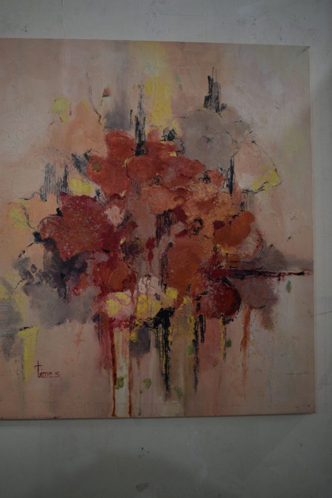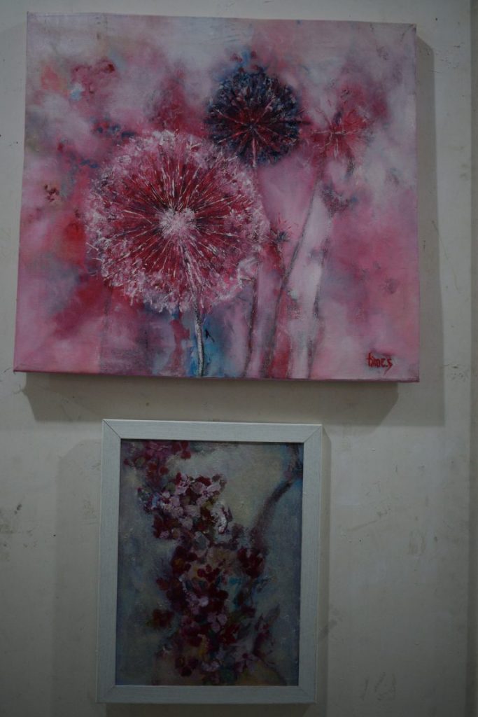 The artist through the flowers highlights the emotions. Therefore, it can be said that it is really a beautiful thing to “throw” the flowers in the painting, in the white space of the fabric, through the lines, colors and shapes, in a real or abstract way but by experienced each through his own spirituality. The technical realization of the paintings is based on two primary materials, fabrics and colors. Then, through the combined technique, it was enabled a faster and more feasible process of effects, shapes, sub-paintings. Although oil paints slow down the drying process, they nevertheless retain their freshness, add vitality and create impressive effects. In this garden we notice that the artist during her creation has consciously conveyed the powerful symbolism of flowers on life, existence, harmony, love and beauty.